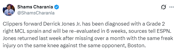 北京时间1月5日,快船又惨遭重创,据名记shams报道,小德里克-琼斯的伤情确诊为右膝内侧副韧带二级扭伤,他将在六周后复查,右膝两次受伤都是被凯尔特人球员压伤。